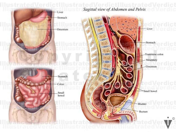 2. Normal anatomy of abdomen, sagittal view: liver, stomach and omentum