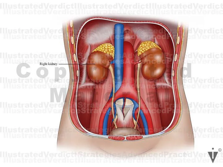 1. Anterior view: anatomy of female abdomen and pelvis: pelvic organs and kidneys