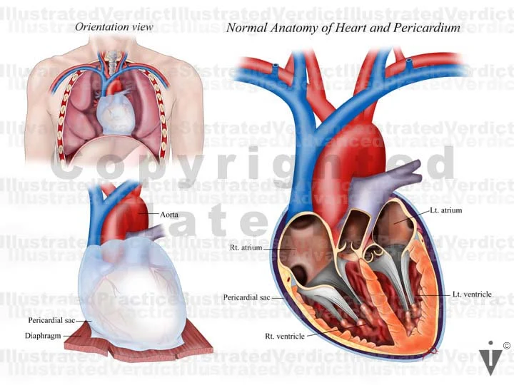 1. Cross section and anterior view: normal anatomy of heart and pericardium