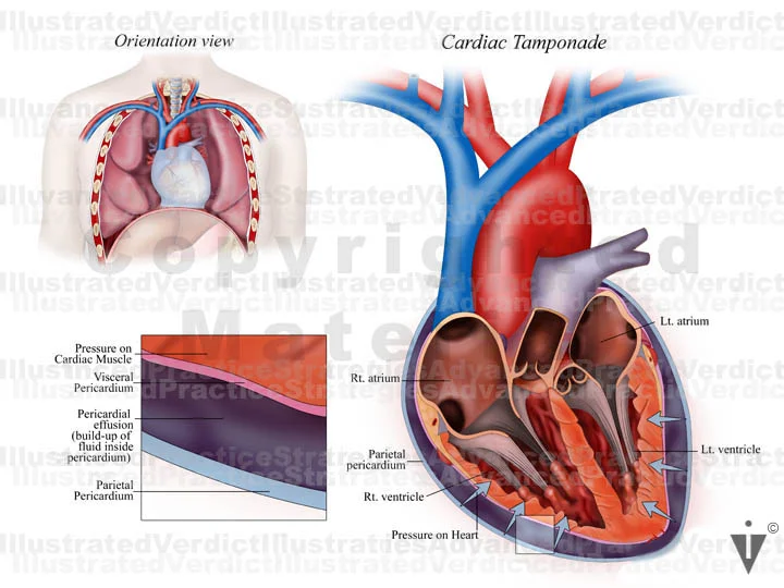 2. Cross section and anterior view: pericardial effusion and cardiac tamponade