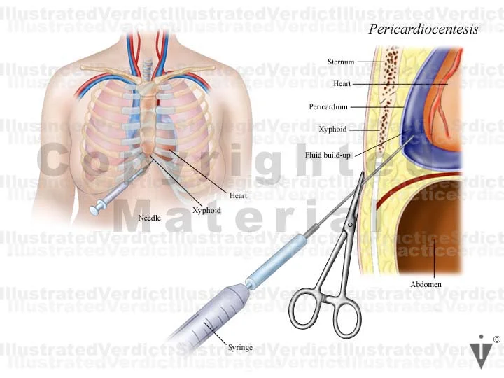 2. Cross section and anterior view: pericardial effusion and cardiac tamponade with needle for pericardiocentesis