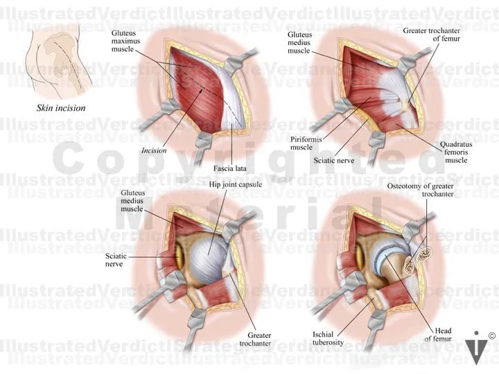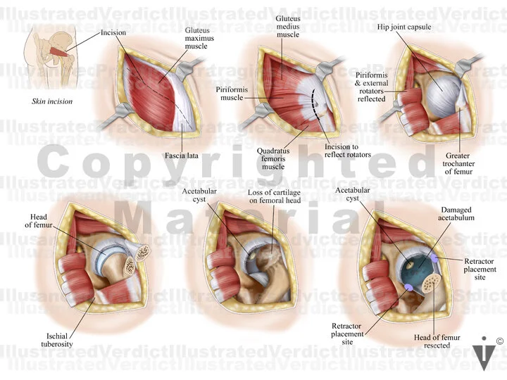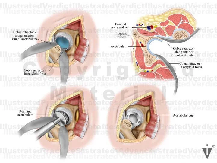 1. Osteotomy of femoral neck and head exposing acetabulum with Cobra retractors