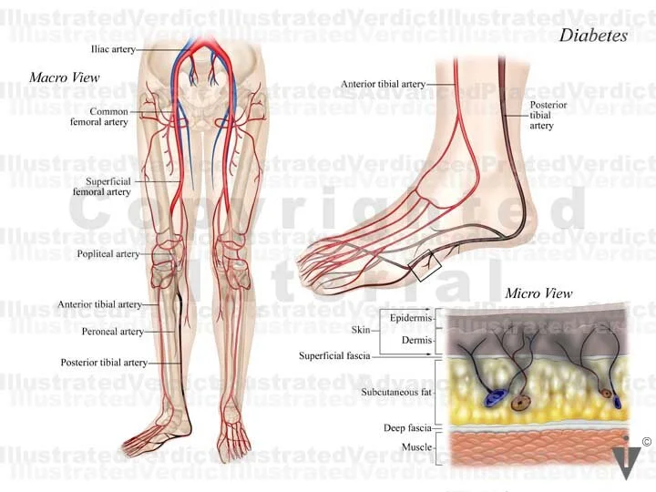 1. Orientation: macro view of affected arteries due to diabetes; anterior/anteromedial view