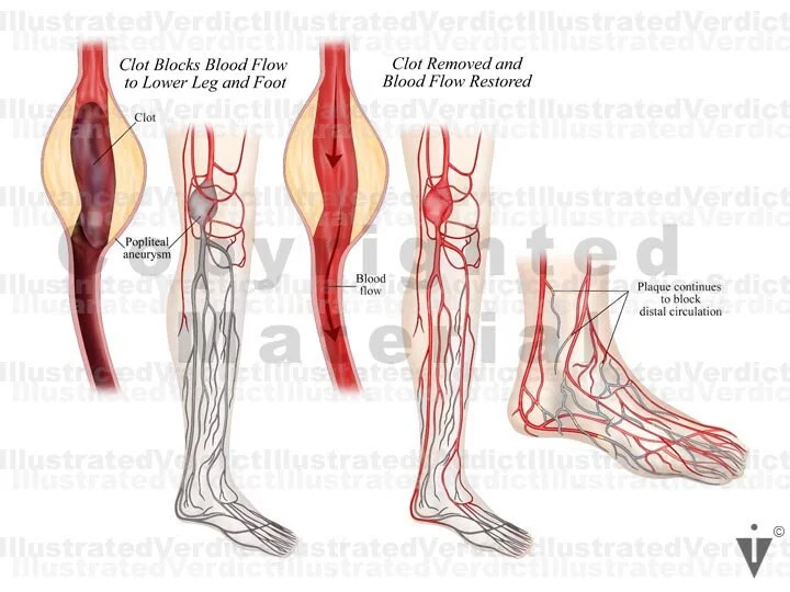 1. Popliteal aneurysm; location and detail: Clot blocking blood flow to lower leg and foot
