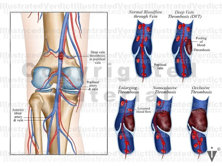 2. Detail: Normal bloodflow, DVT, Enalrging thrombus, non occlusive thrombosis, occlusive thrombosis