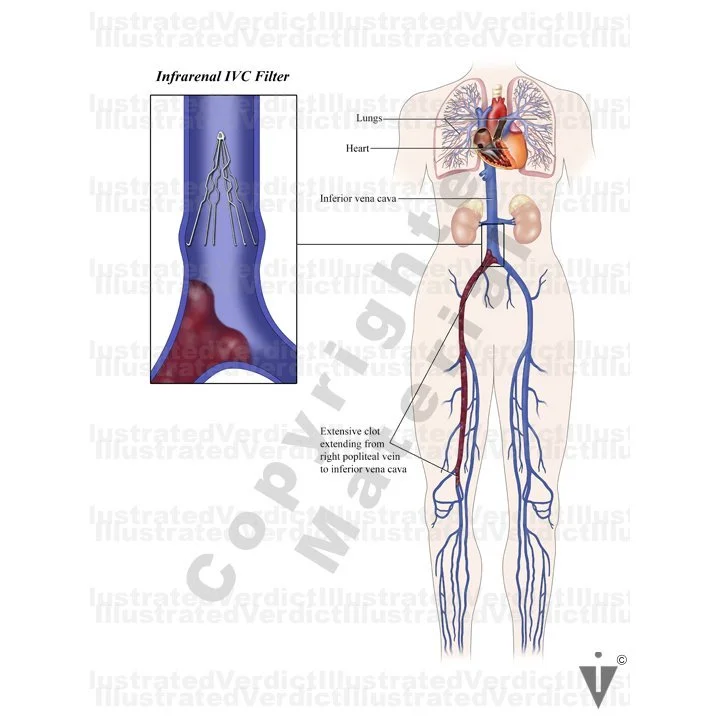 1. Deep vein thrombosis (DVT) in leg and venous circulation to heart and lungs