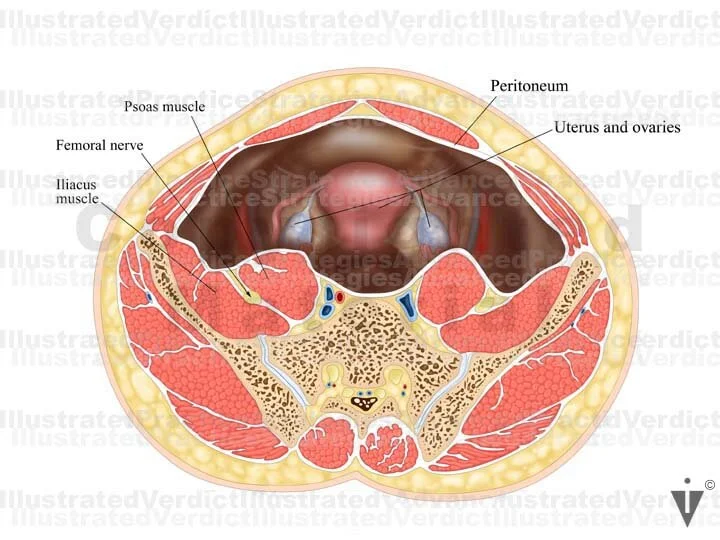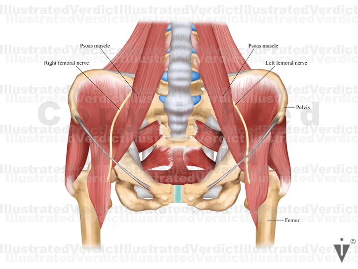 1. Anatomy of pelvis, femoral nerves and psoas muscles; anterior view