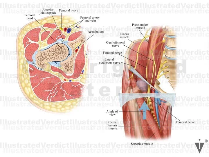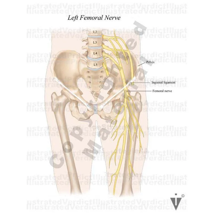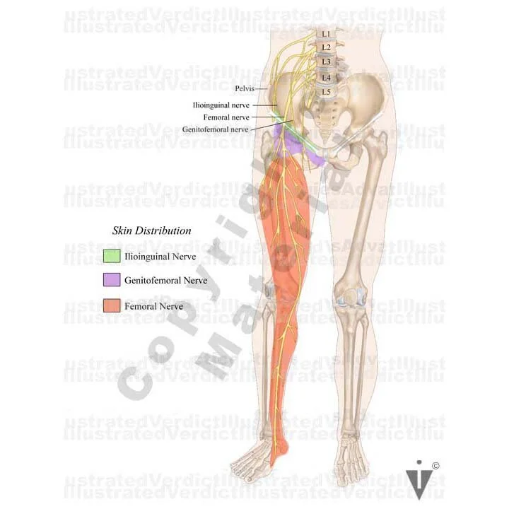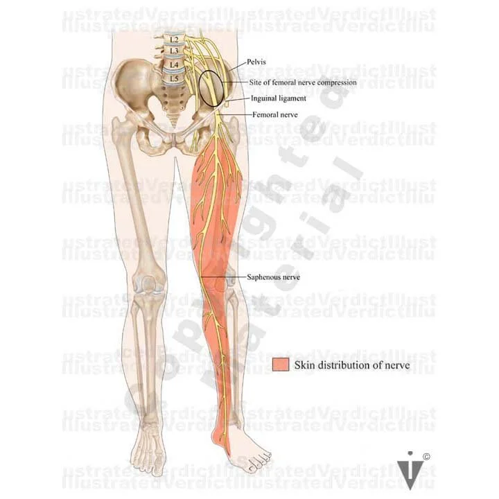 1. Femoral nerve compression and skin distribution of femoral nerve; anterior view