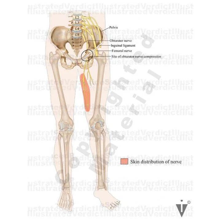 1. Obturator nerve compression and skin distribution of obturator nerve; anterior view