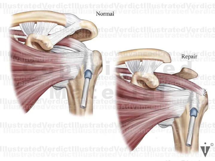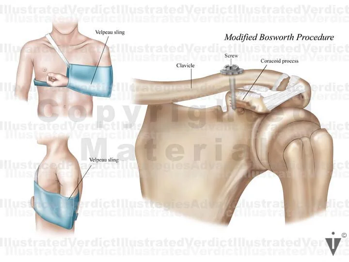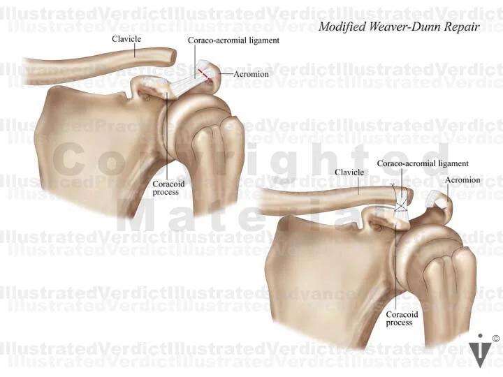 2. Modified Weaver-Dunn repair: coraco-acromial ligament reattached to distal end of clavicle