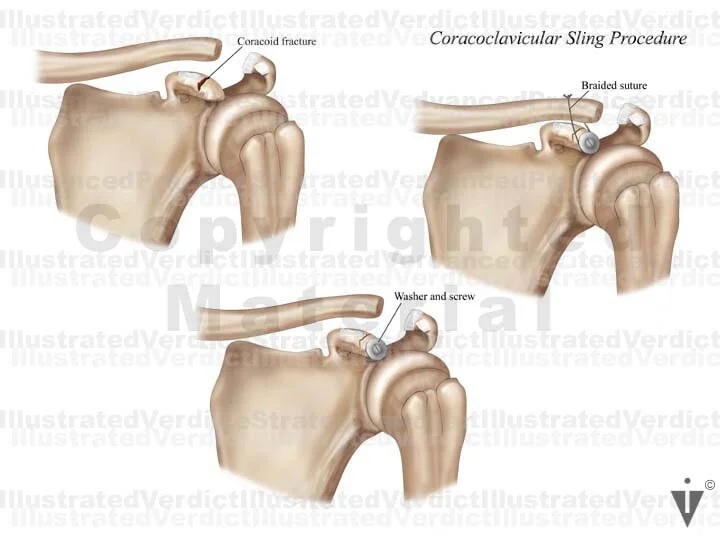 3. Coracoclavicular sling procedure (3/26/98): braided suture wrapped under washer and screw, around end of clavicle
