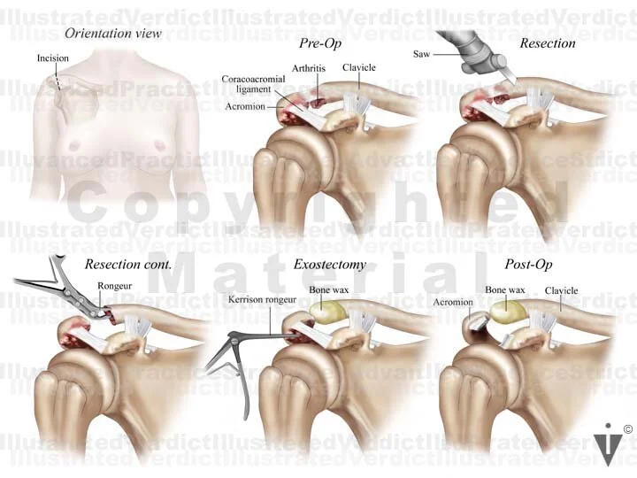 1. 1-2cm clavicle resected and coraco-acromial ligament cut from acromion