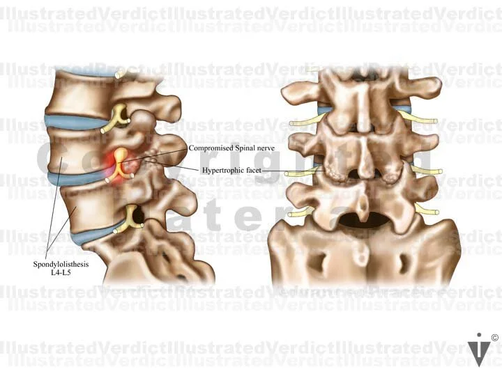 1. Lateral view: spondylolisthesis and hypertrophic facet causing compromise to L4 spinal nerve